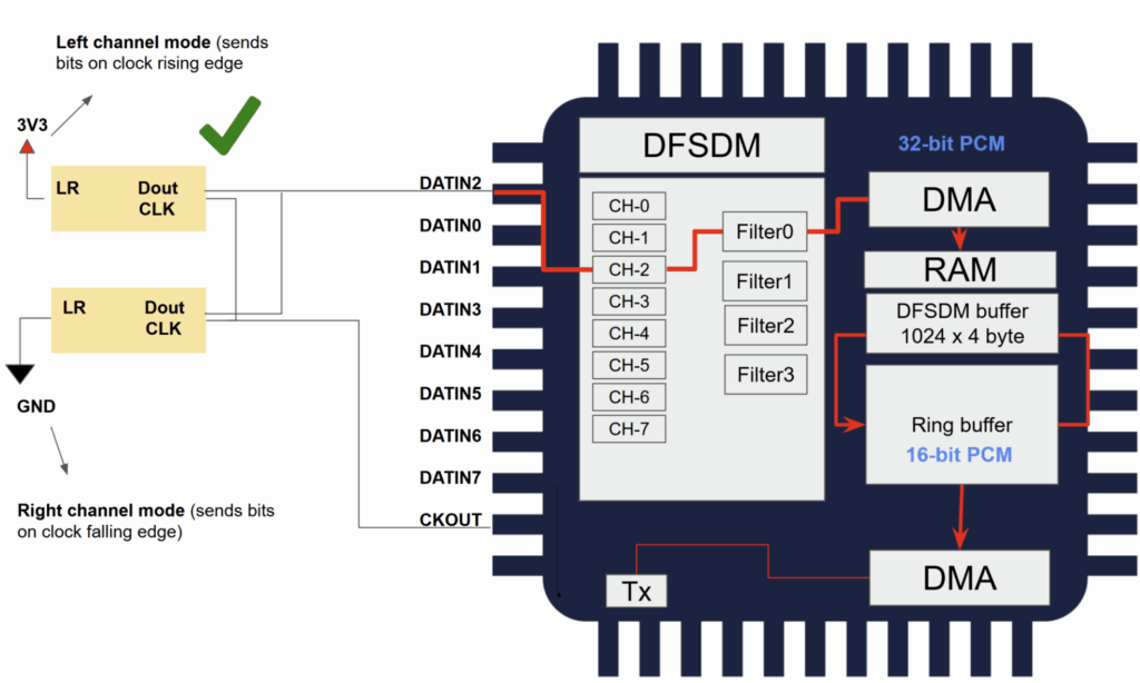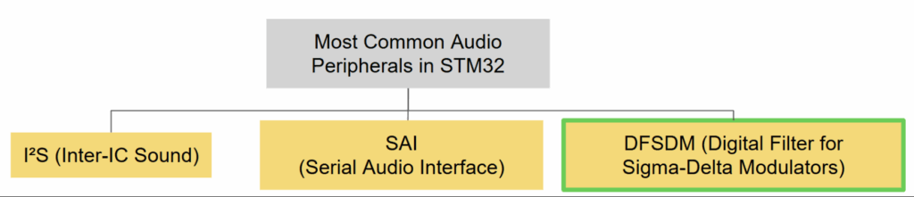 In this post, I’ll guide you through the first step: recording audio in WAV format using a MEMS microphone and the STM32L4’s audio peripherals. Subsequent posts will cover the other components of a complete voice assistant system. As an STM32 fan, I’ll be using STM32 MCUs for all my TinyML projects. STM32 offers three common built-in audio peripherals, as follows and in this tutorial, I’ll focus on DFSDM. As an STM32 fan, I’ll be using STM32 MCUs for all my TinyML projects. STM32 offers three common built-in audio peripherals, as follows and in this tutorial, I’ll focus on DFSDM.