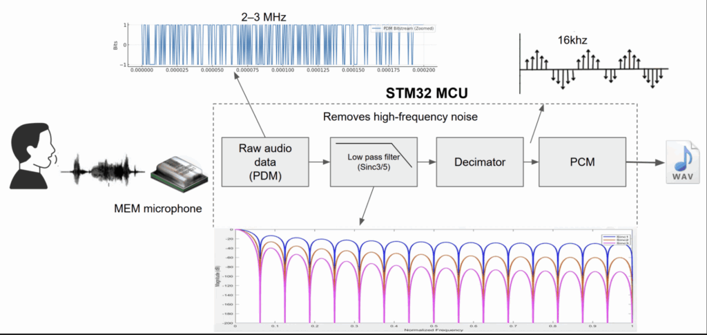 • Decimator downsamples the PDM signal from the MEMS microphone (e.g., MP34DT01, which outputs 2–3 MHz) to a usable 16 kHz PCM signal for voice recognition.