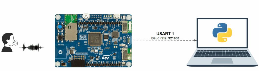 Each data packet is an integer (4 bytes), and we use a buffer of 1024 elements. Then, DMA1 Channel 2 takes the stored data and sends it through USART1 Tx, where it is received by a Python script on the PC and saved as a WAV file. Here is the overall process: