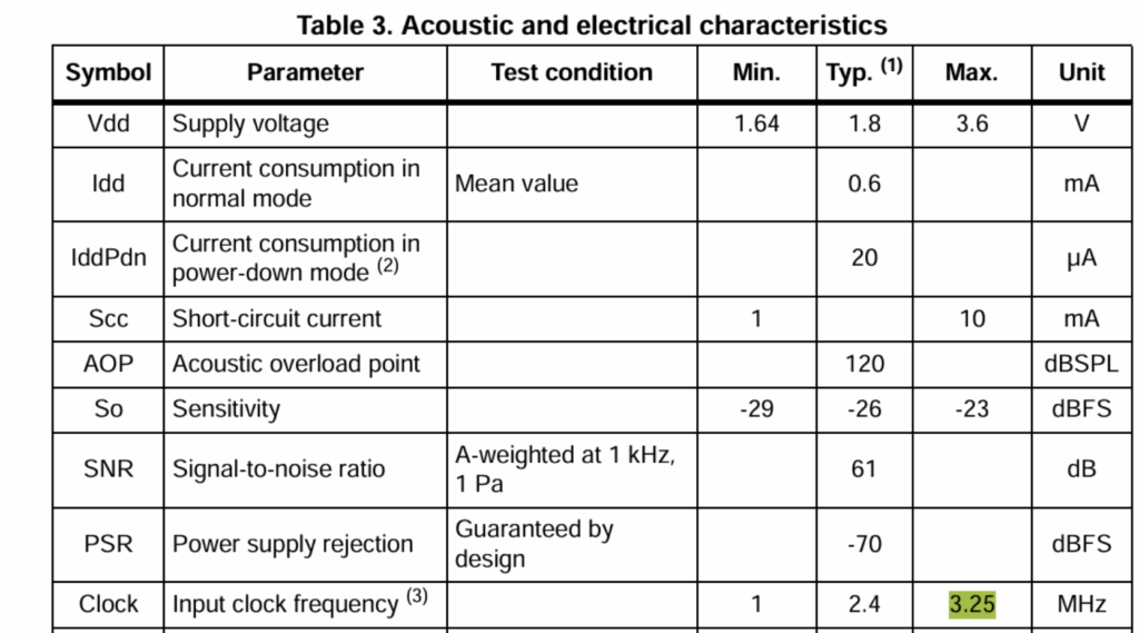 4. The maximum frequency is 3.2 MHz because I am using a digital MEMS microphone, the MP34DT01-M from STMicroelectronics, which supports up to 3.25 MHz.