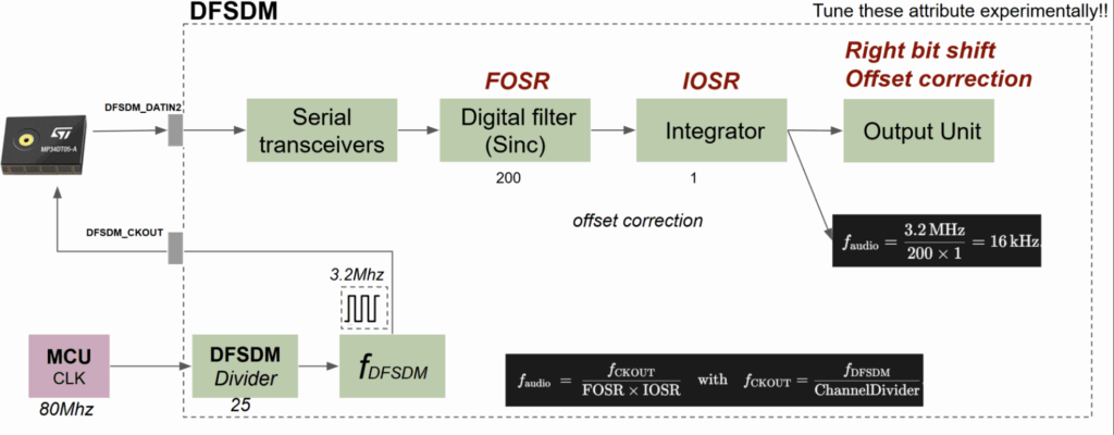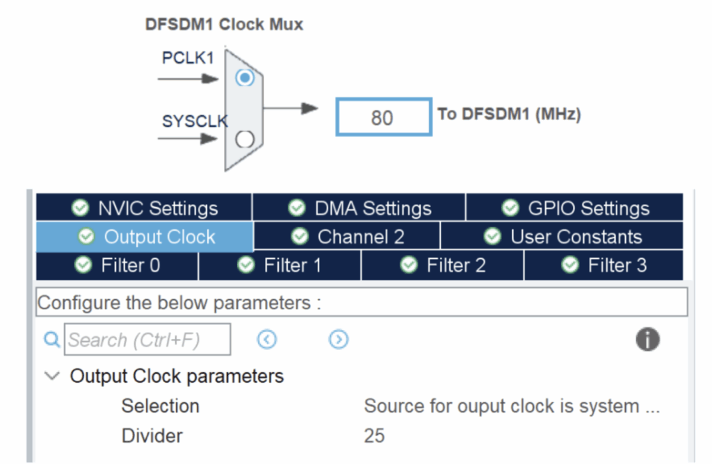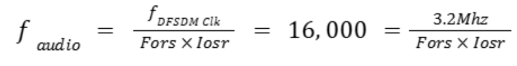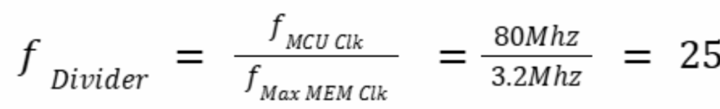 The first step is to configure the correct frequency that will be supplied to the DFSDM. Since the MEMS microphone has a maximum frequency of 3.2 MHz and my MCU clock is 80 MHz, we need to calculate the proper divider value. The divider can be found using the formula:
