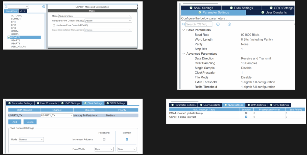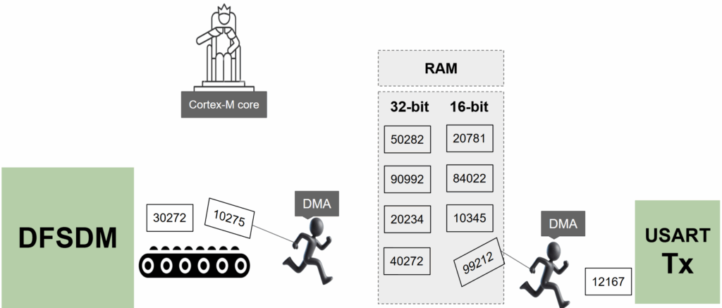 In this tutorial, I am going to show how to use DMA with DFSDM and USART to reduce the MCU’s workload. Think of the Cortex-M core as the king of the MCU. It is smart, makes decisions, and runs the main logic, but it should not waste time on repetitive tasks. For that, it relies on DMA, which acts like a dedicated worker. The DMA is very efficient at doing one simple job over and over: moving data between peripherals and RAM. Since audio recording fits into this model, we will use two DMA channels. DMA1 Channel 1 is responsible for capturing the bitstream from DFSDM and saving it into RAM.
