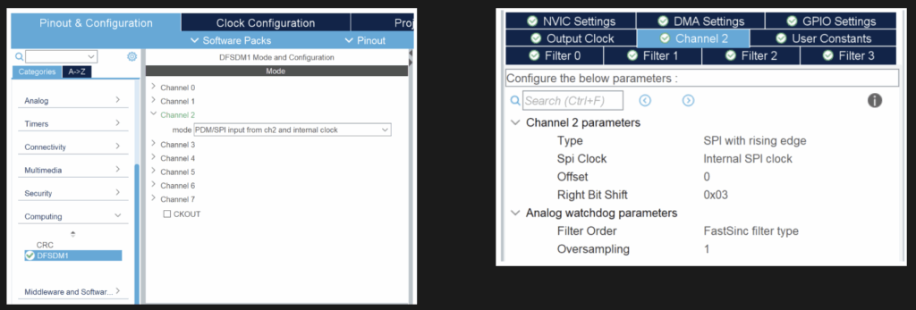 In this tutorial, the goal is to write a program that receives real-time 24-bit PCM data from the DFSDM via DMA1 Channel 2.