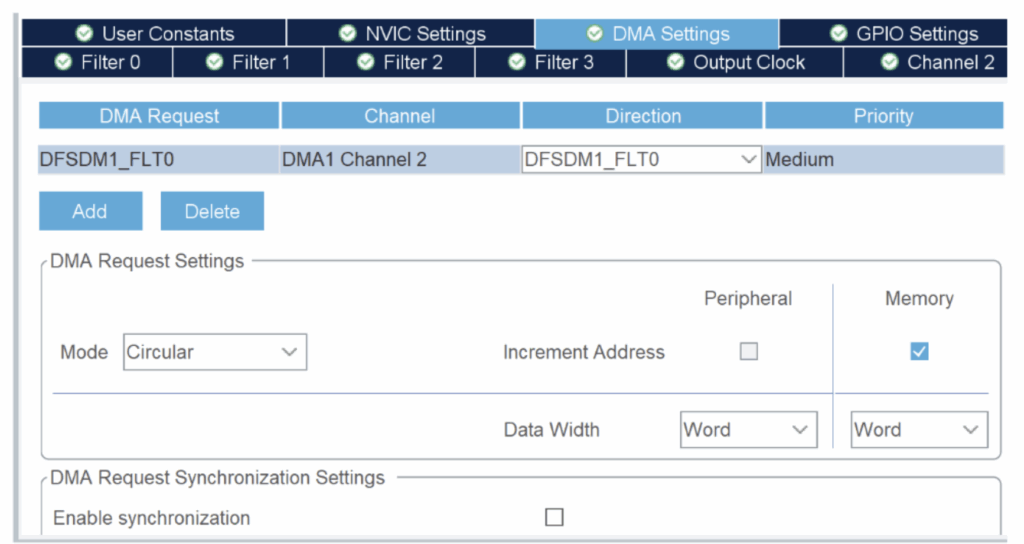 In DFSDM DMA configuration, enable Memory Increment so that the samples are stored sequentially in the buffer, and set the data width to Word, since the sample resolution is 24-bit.For the DMA mode, choose Circular. This mode triggers two callback functions: one when the first half of the buffer is filled, and another when the second half of the buffer is filled.